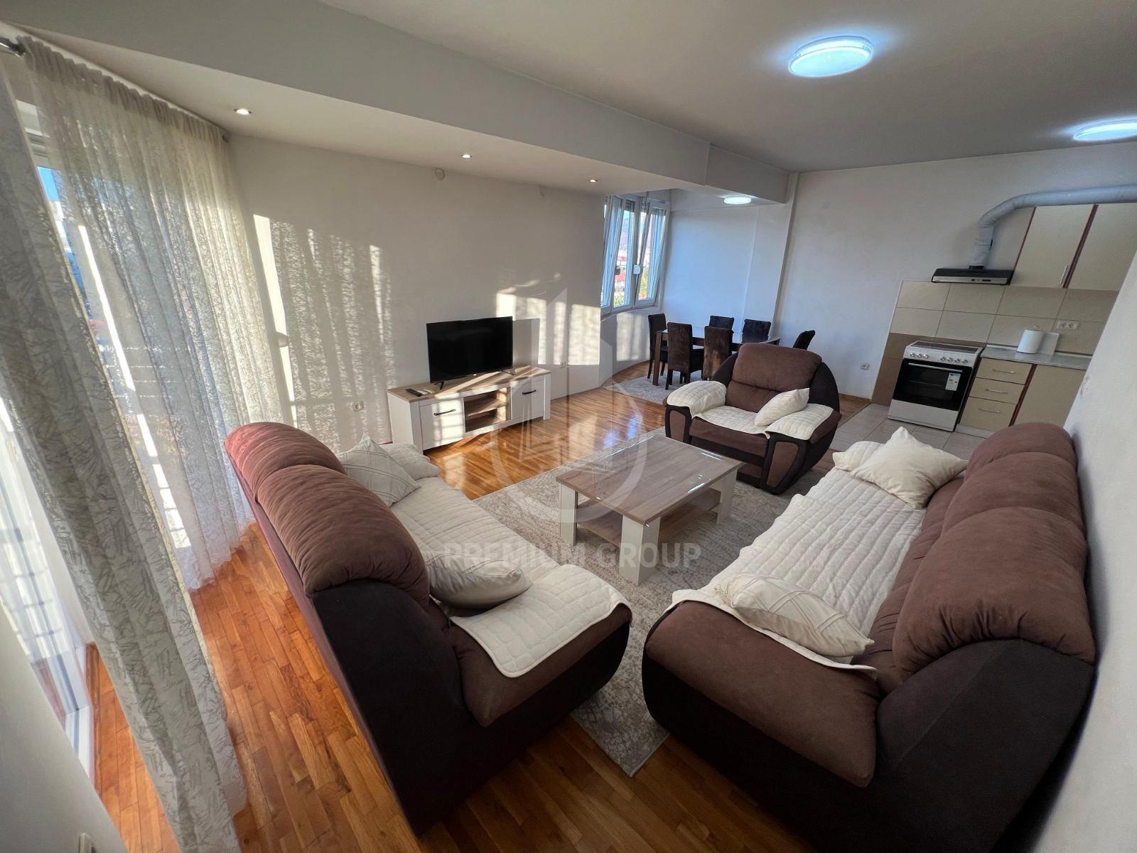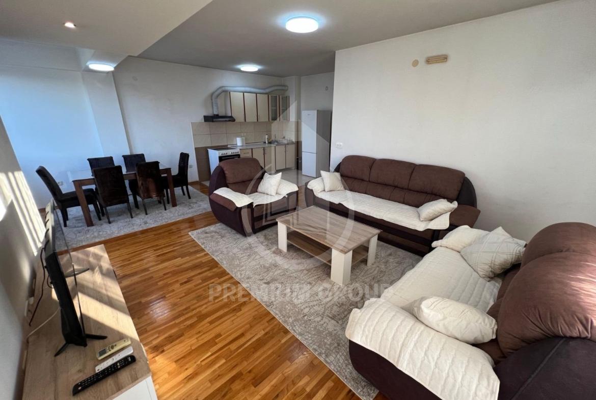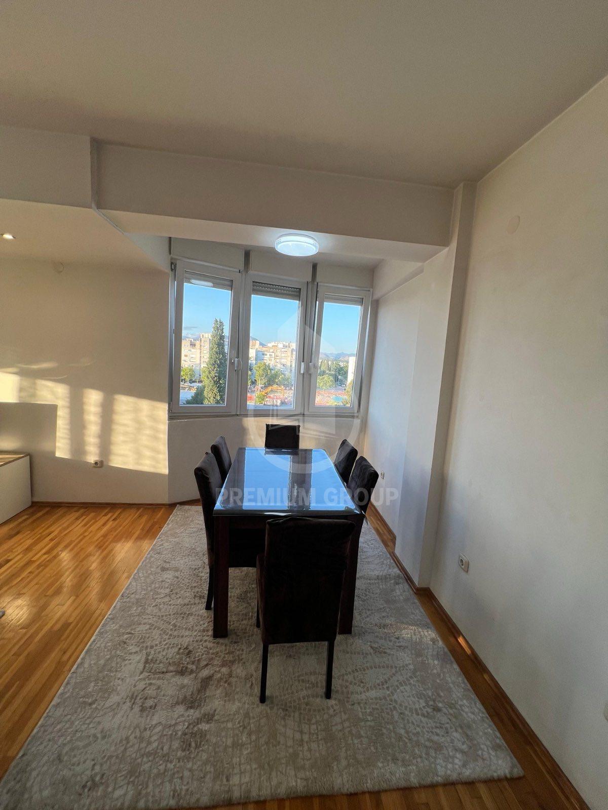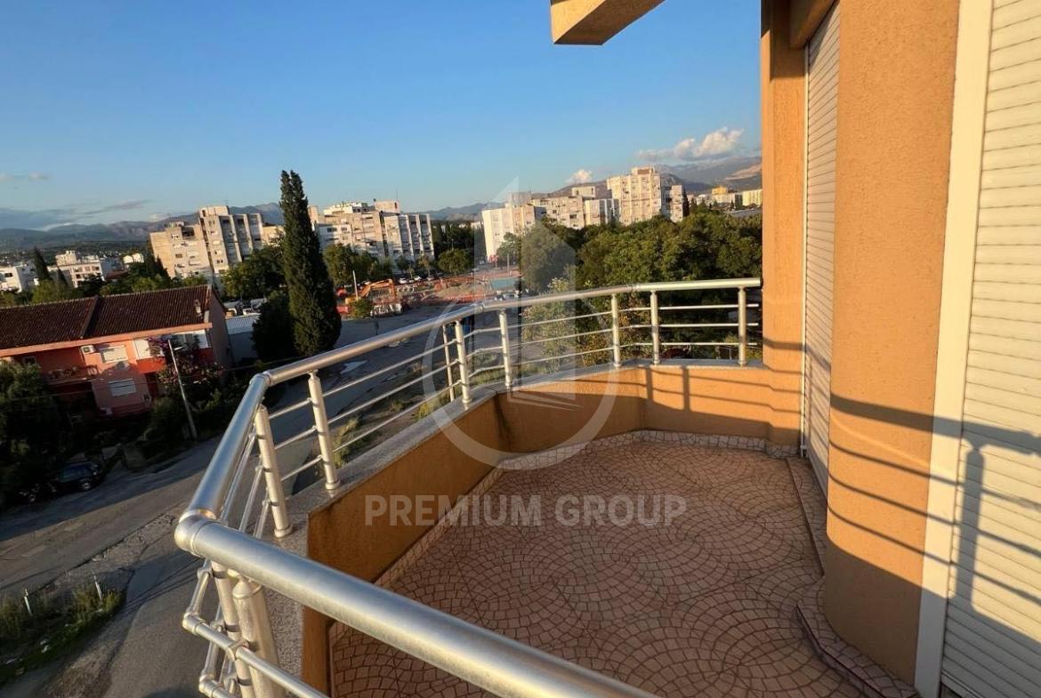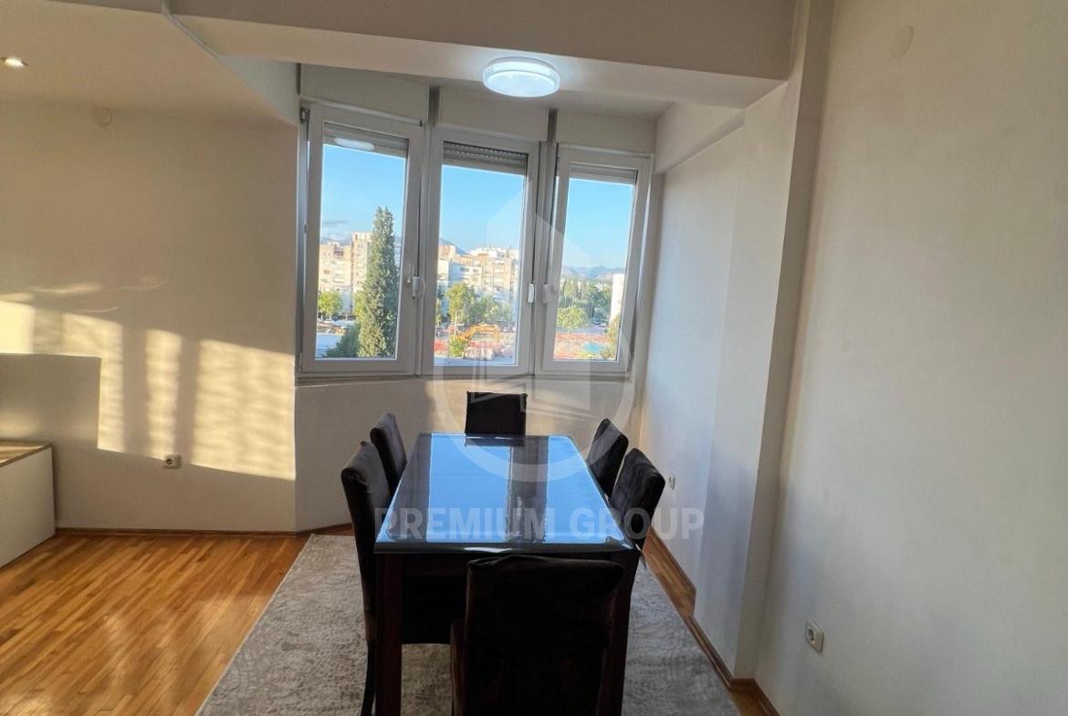 Iznajmljuje se veći dvosoban namješten stan 64m2 u stambenoj zgradi na Zabjelu. Na trećem je spratu, a zgrada posjeduje lift. Stan je prostran, sa velikim i prozračnim prostorijama. Sastoji se od: ulaznog hodnika dnevnog boravka, trpezarije, kuhinje, dvije spavaće sobe, kupatila, toaleta i velike terase. Na terasu postoji mogućnost izlaska iz dnevnog boravka i obje spavaće sobe. Potpuno je namješten posjeduje sve što je neophodno za život. U blizini su svi potrebni sadržaji za svakodnevan život. Pri useljenju daju se krija i depozit.