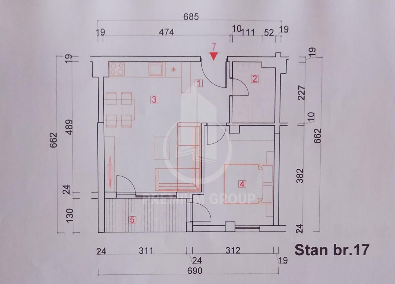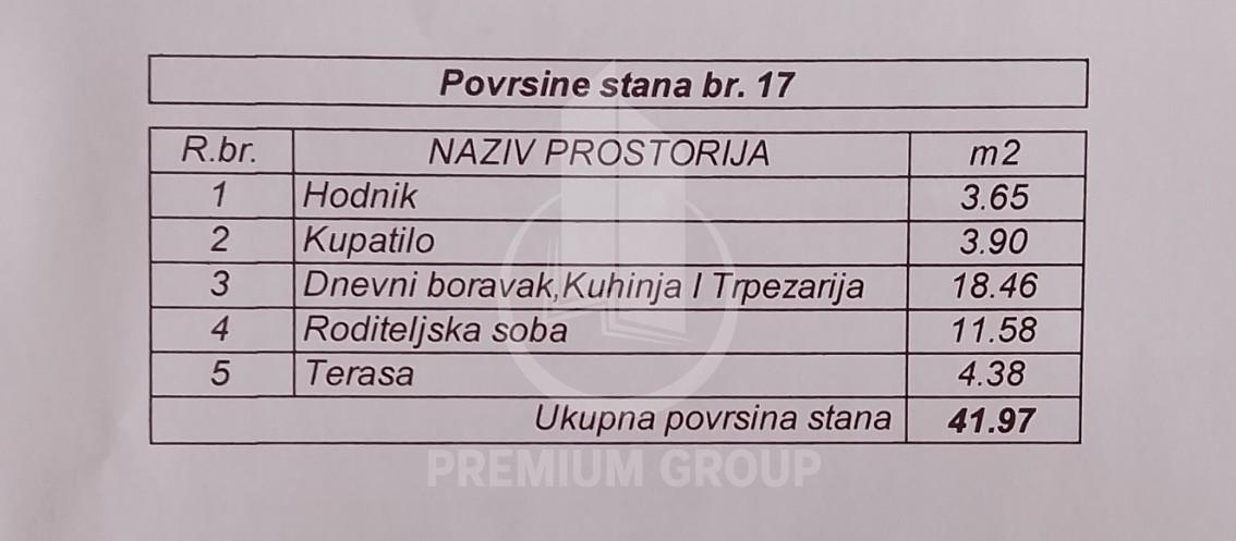 Prodaje se jednosoban stan u izgradnji ukupne stambene površine 42m2. Pozicioniran je u okviru luksuzne zgrade koja se prostire na pet spratova sa velikim brojem stambenih jedinica i jednoj od najatraktivnijih lokacija, odmah iza kvarta Central Point.