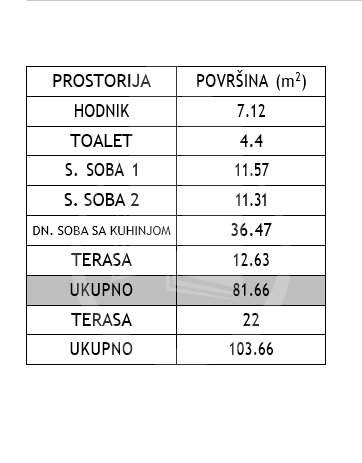 Struktura stana: ulazni hodnik, veliki dnevni boravak, kuhinja, dvije spavaće sobe, kupatilo i dvije terase.