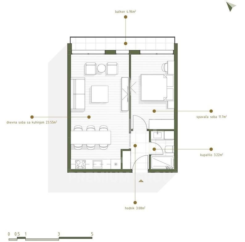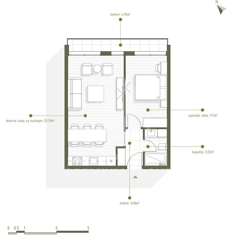 Stan se sastoji od: ulaznog hodnika, dnevnog boravka sa kuhinjom, spavaće sobe,kupatila i terase.