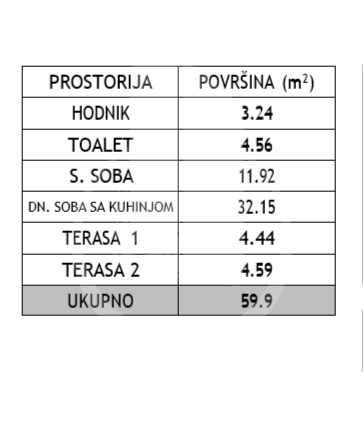 Struktura stana: ulazni hodnik, veliki dnevni boravak, kuhinja, spavaća soba, kupatilo i dvije terase.