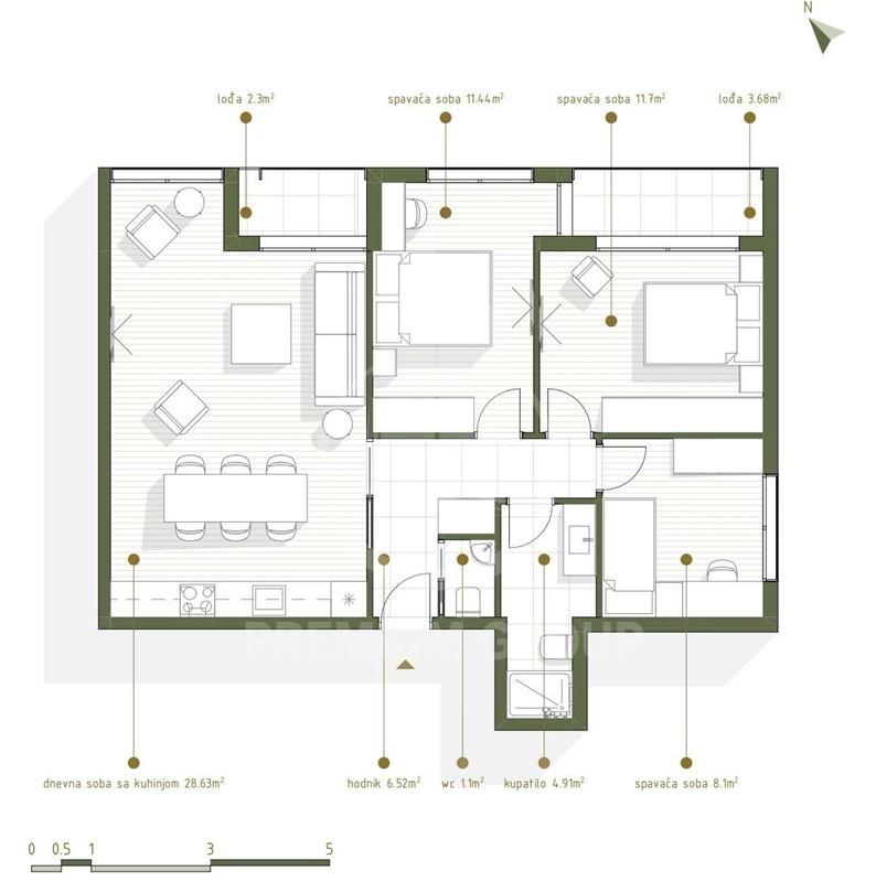 Stan se sastoji od: ulaznog hodnika, dnevnog boravka sa kuhinjom, tri spavaće sobe, kupatila, toaleta i terase.
